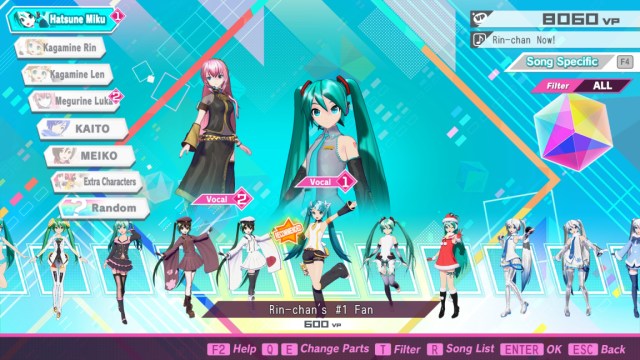 The only real progression is that by completing songs you earn VP to spend on cosmetics. Different outfits, hairstyles, accessories, and custom T-shirts can be purchased. The amount of cosmetics present is impressive, with Miku alone having almost 200 different outfits to choose from. The rest of the cast doesn’t have quite that many, but there’s a good selection regardless. More than 400 costumes are available.