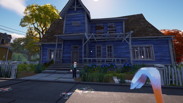 The first house you can visit in Hello Neighbor 2 is owned by a policeman. In what serves as an introduction to the game’s stealth mechanics, it gradually turns into a buggy and comical mess. Firstly, the AI can be easily tricked. If the cop sees you, he beelines in your direction, though you could just as easily backtrack to the sidewalk and he’ll do nothing but stare. That allows you to circle around the house to enter it and grab the important stuff you need. Of course, if you do get caught, you’ll be taken back outside. You’ll lose all the items found inside the house, but you can reacquire them again.
