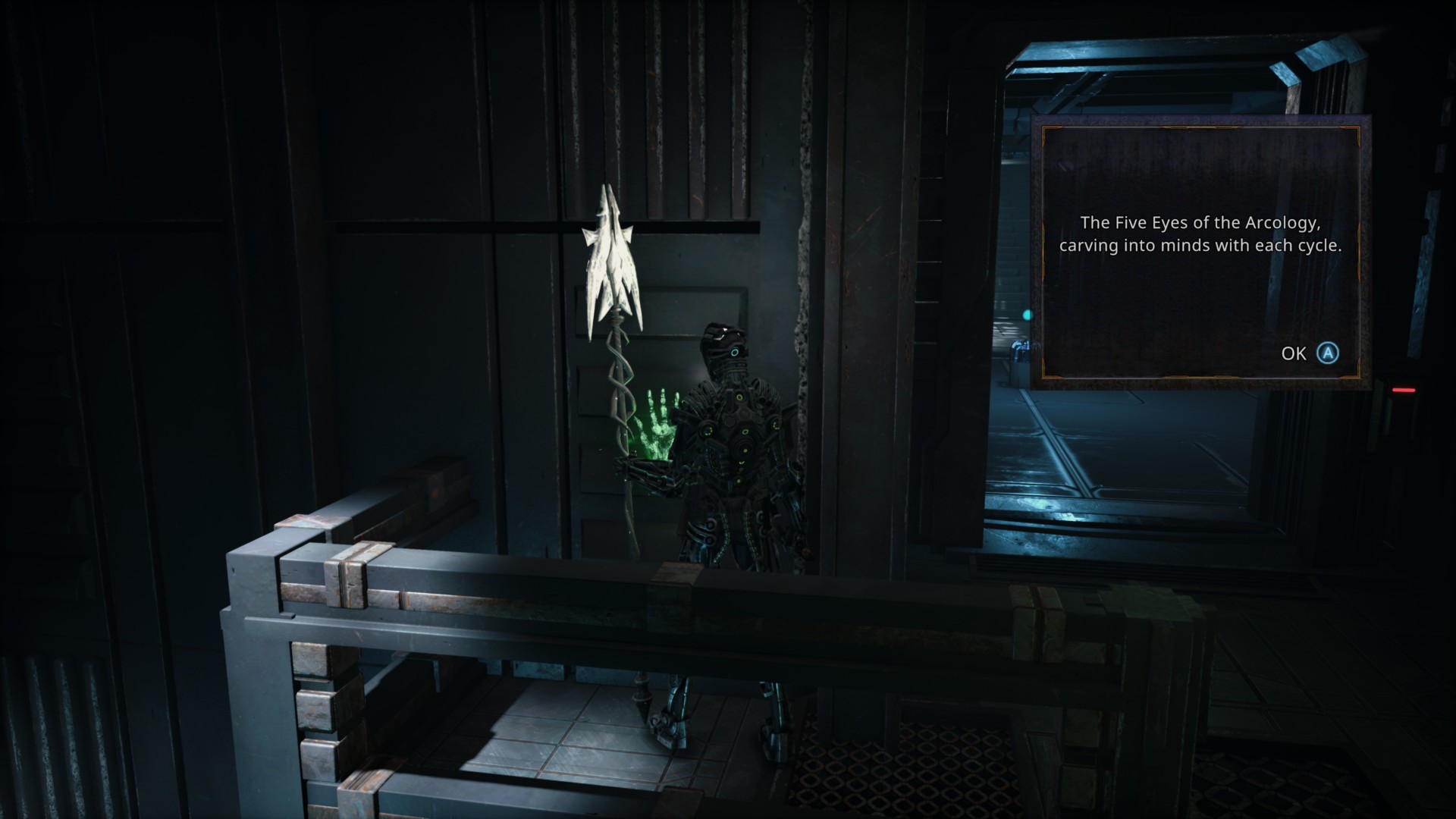 This doorway has an elevator that’s not available (yet). However, it does give us a clue about “the Five Eyes of the Arcology.”