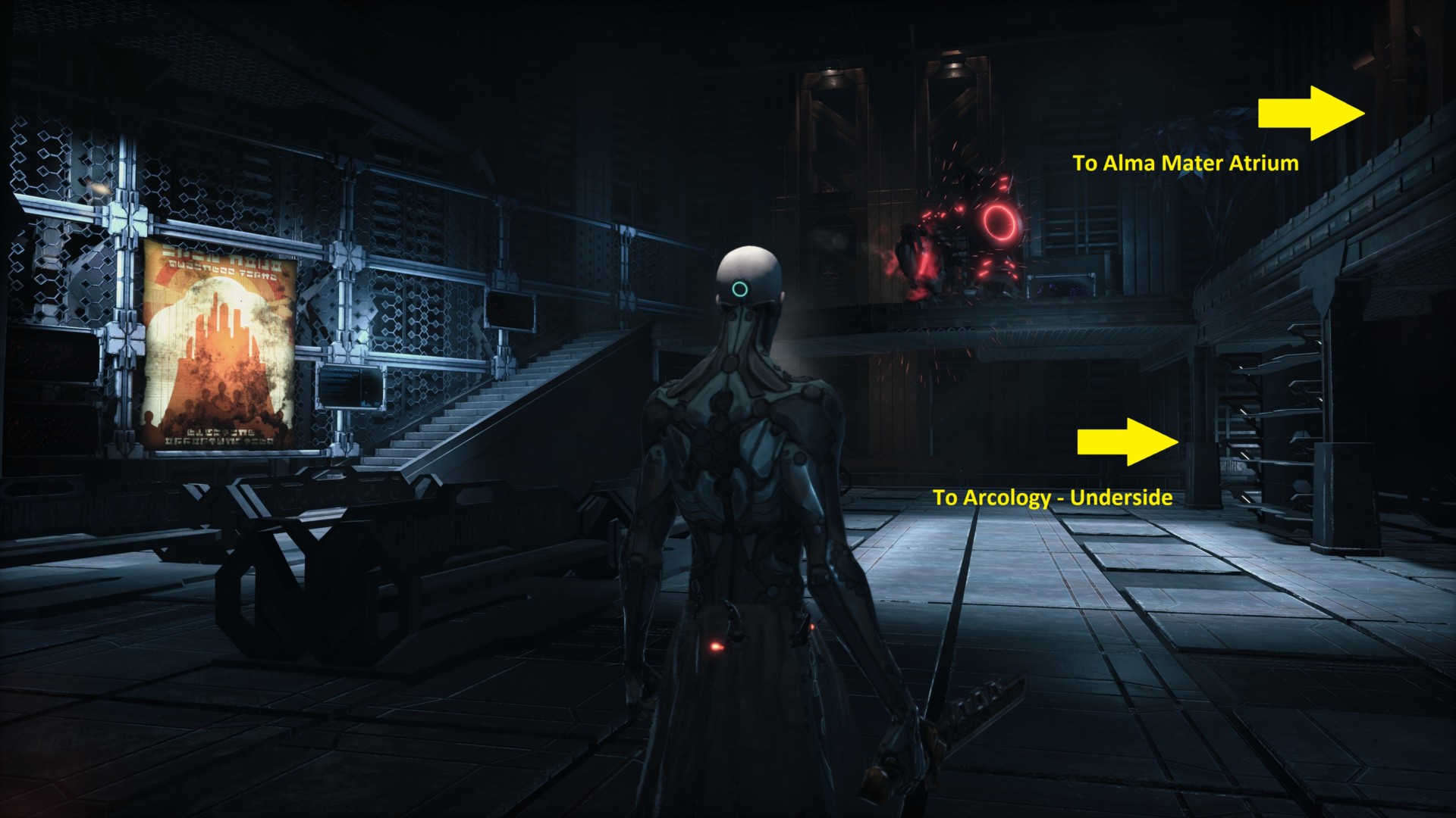 Let’s go back to Hellpoint‘s Ikari Walkways zone. Remember the room where you killed the Artillery boss? Make your way there. Go to the floor above that (the one leading to Alma Mater Atrium) and follow the corridor.