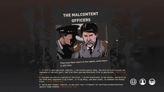 The most likely outcome of HighFleet text adventures is increasing or decreasing one or more of your morality scales. They represent how much you value faith, money, Romani values, Geratian values, and so on. Collect enough scale, and it will gain a level. Congrats, now your crew expects you to act accordingly, and your dialogue choices will now show whether they approve or disapprove of your choices. Yet the rabbit hole goes deeper: the value scales also act as skills, and in certain critical moments, dialogue choices will also roll for success on that scale. Sure, you are a tarkhan (captain) who promotes Romani values, but are you really good at upholding about them? Only time will tell.
