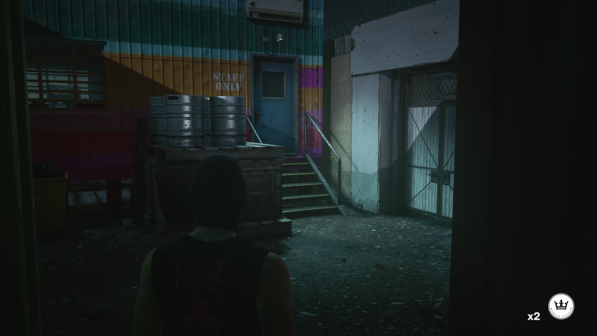 When you reach the back corner, dump his body in the murky water. This also completes the “Spree Party” assassination challenge. Don’t forget to loot the keycard hacker to help you with exploration.