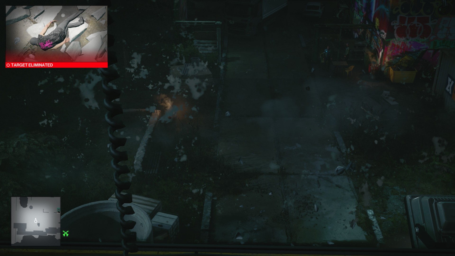 There are several ways to take him out. It’s even possible to go to the walkway connecting the two facilities, find the bag of bricks, and drop it on him as he’s moving around. This will complete the “Suck a Bag of Bricks” assassination challenge.