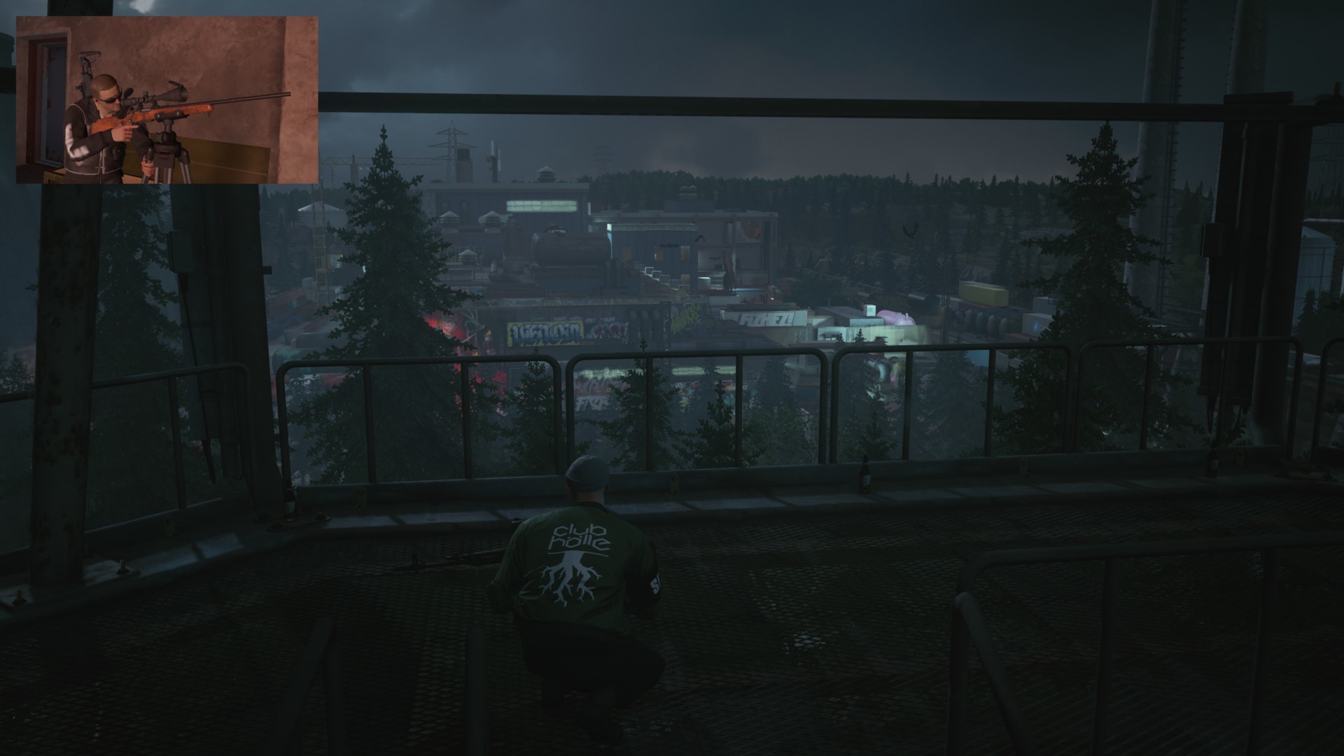 The Sniper is Agent Tremaine of the ICA. He’s all the way at the northeastern edge of the map high atop the biker hangout/factory.