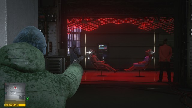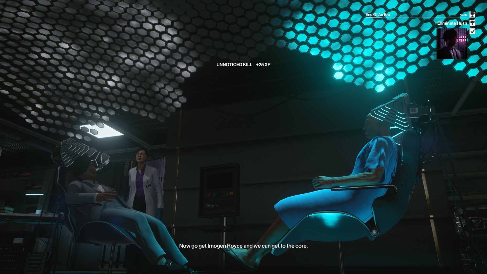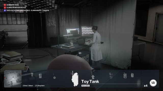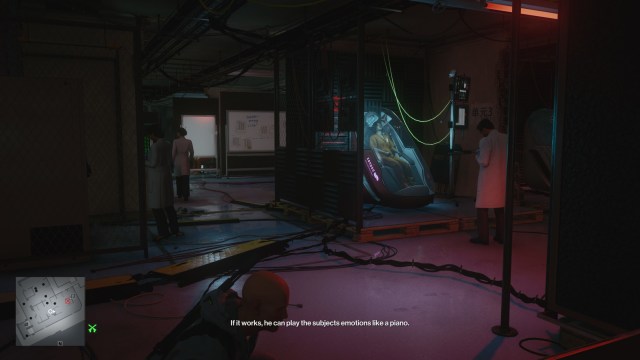 Assuming you didn’t present yourself to Hush’s assistant (and she’s still alive and well), Hush will storm off since the test subject hasn’t left the bathroom yet. While he’s ranting, go inside the Therapy Room and subdue the researcher and the guard. Hide their bodies and put the fuse cell (the one from the Derelict Apartments) inside the panel.
