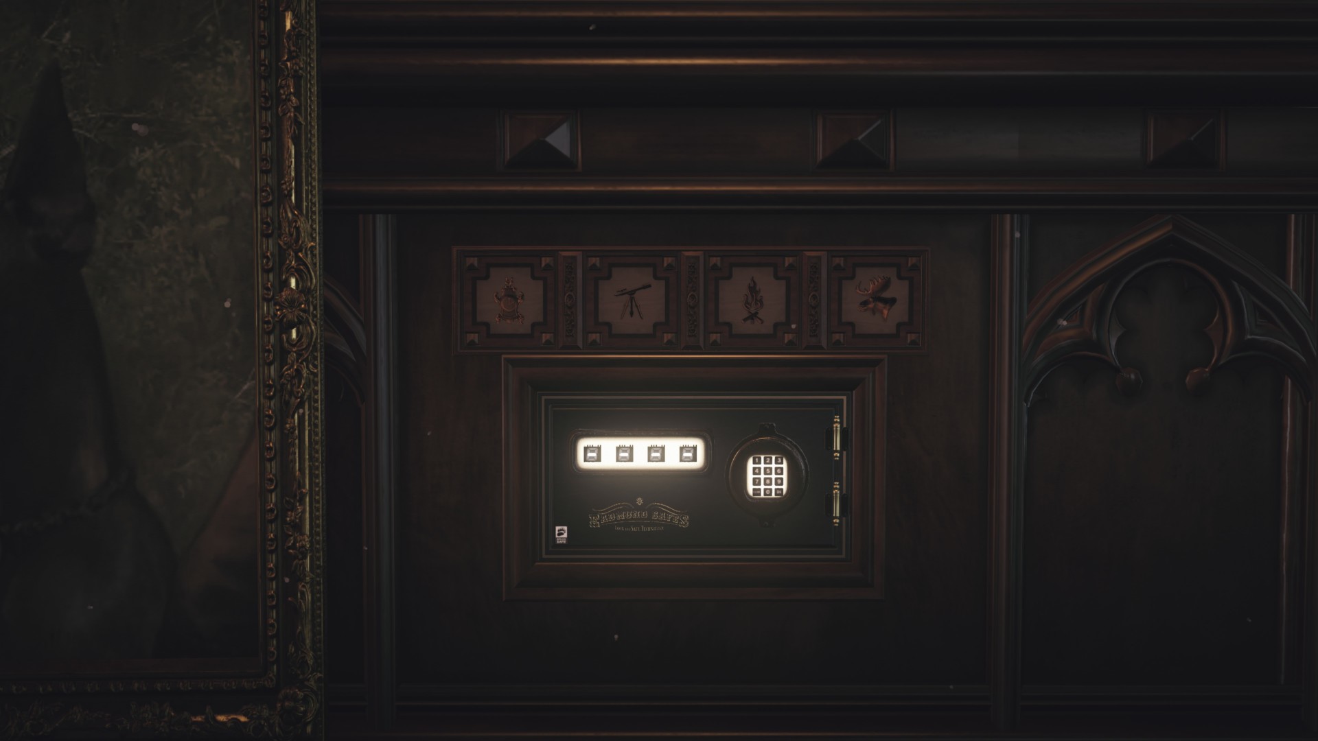The safe has odd symbols which correspond to a particular number. You’ll find their representations around the room: