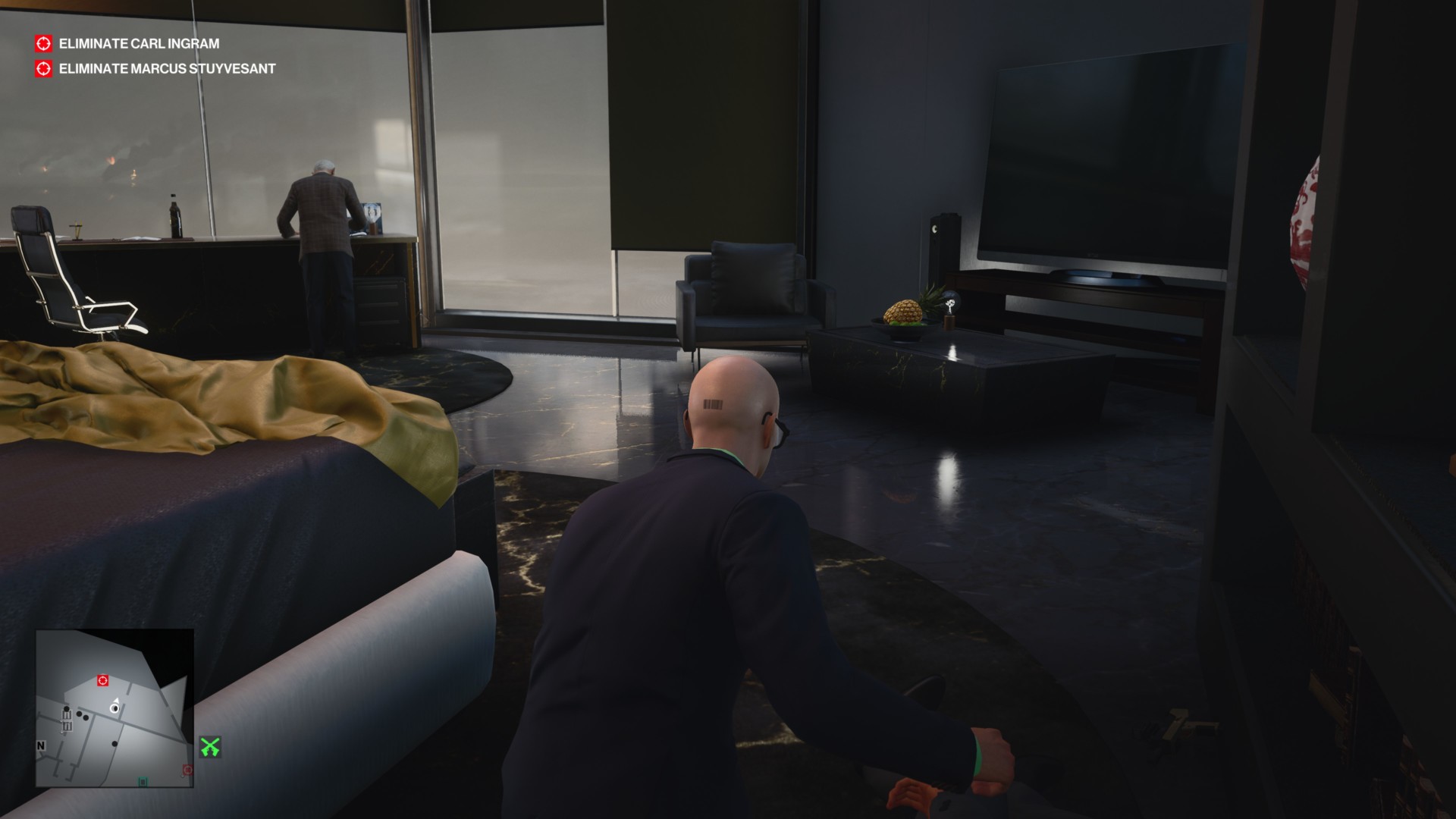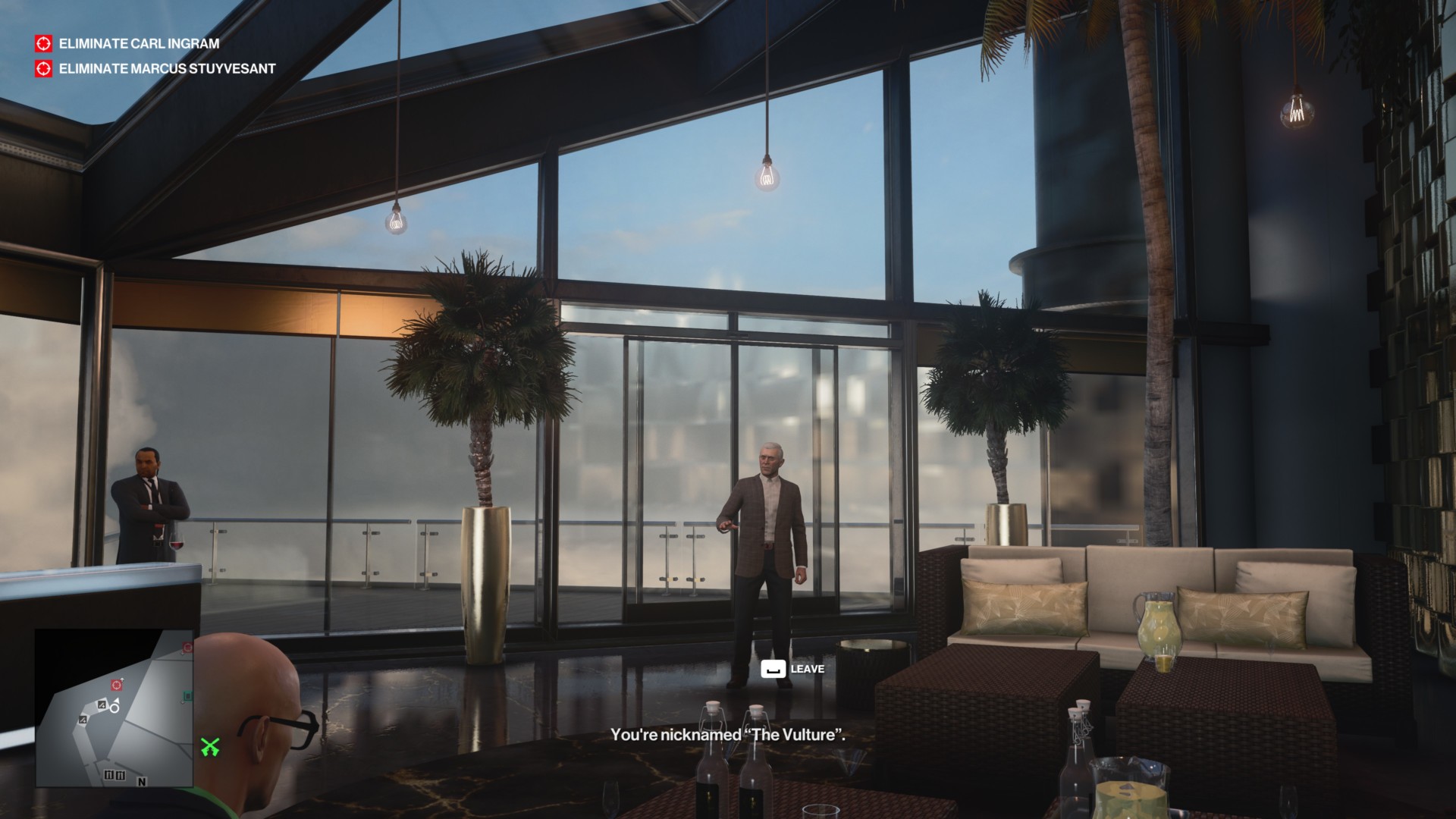 Now, if you let Ingram live (temporarily), he’ll walk to the adjoining office room and tell you of his plans to eliminate Arthur Edwards, the Constant. After this, he’ll tell you to leave the penthouse. His bodyguard will try to escort you, and dawdling around will make everyone suspicious.
