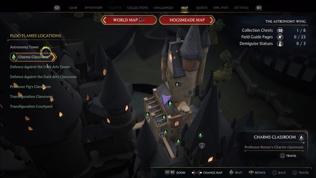 To solve the Charms Classroom Door Puzzle in Hogwarts Legacy, you’ll want to make your way to the area via the Floo Flames fast travel point (Astronomy Wing tab). The puzzle itself is right beside the Floo Flames and you can’t miss it (as seen on the featured image of this guide).