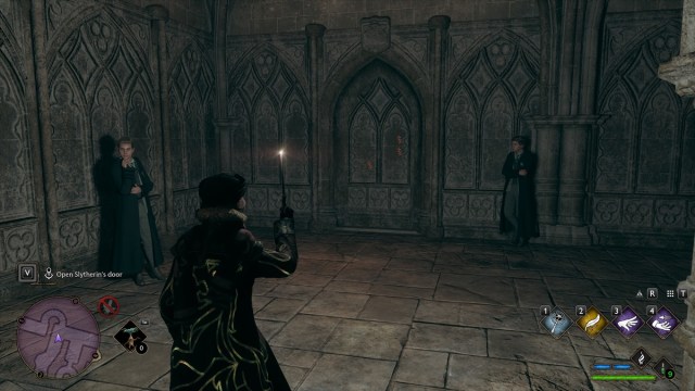 You’ll start things off by talking to Sebastian in front of the Slytherin Common Room. Simply fast travel to Grand Staircase: Lower Grand Staircase to find him waiting for you. You’ll then be joined by Ominis, and the three of you will head to a nearby hallway. There, you’ll notice etched symbols on the wall (seen in the image above). The goal here is to use a fire spell like Confringo to light the torches. Start with the two on your right, then the one at the back.