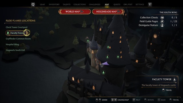 To solve the Faculty Tower Puzzle in Hogwarts Legacy, you’ll want to make your way to the area via the Floo Flames fast travel point (South Wing tab). And, just to be clear, you don’t want to do this in the middle of Gladwin’s initial quest. That’s because this counts as a restricted area, with teachers and prefects patrolling about. Once you do finish Gladwin’s initial quest, you may explore this place without any issues.
