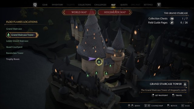 To solve the Grand Staircase Tower Door Puzzle in Hogwarts Legacy, you’ll want to make your way to the area via the Floo Flames fast travel point (Grand Staircase tab). If you’re in the area, simply follow the looping steps almost all the way to the top. You should, eventually, see the puzzle carved neatly on a wall next to several portraits.