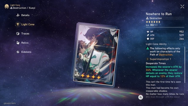 If you don’t yet have that Light Cone, I’d go for “Nowhere to Run” (increases ATK, and when you defeat an enemy you restore HP), or “Under the Blue Sky” (increases ATK, and when you defeat an enemy, CRIT Rate increases for three turns). These are both great 4-Star Light Cones you can use until you find the best 5-Star one.