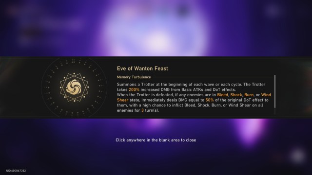 Memory Turbulence: Summons a Trotter at the beginning of each wave or each cycle. The Trotter takes 200% increased DMG from Basic ATKs and DoT effects. When the Trotter is defeated, if any enemies are in Bleed, Shock, Burn, or Wind Shear state, immediately deals DMG equal to 50% of the original DoT effect to them, with a high chance to inflict Bleed, Shock, Burn, or Wind Shear on all enemies for 3 turns.