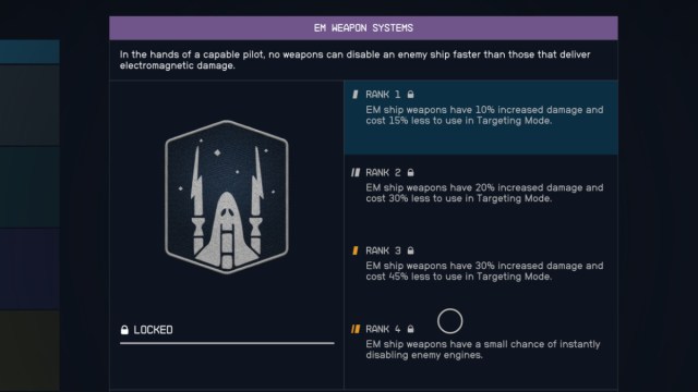 Just like with handheld EM weapons, you can also upgrade ship EM weapons via the dedicated EM Weapon Systems in the Tech skill tree. Rank 1 increases damage by 10% and reduces targeting costs by 15%. Rank 2 increases damage by 20% and reduces targeting costs by 30%. Rank 3 increases damage by 30% and reduces targeting costs by 45%. Lastly, Rank 4 adds a chance to immediately disable enemy ship engines. Consider the possibilities.