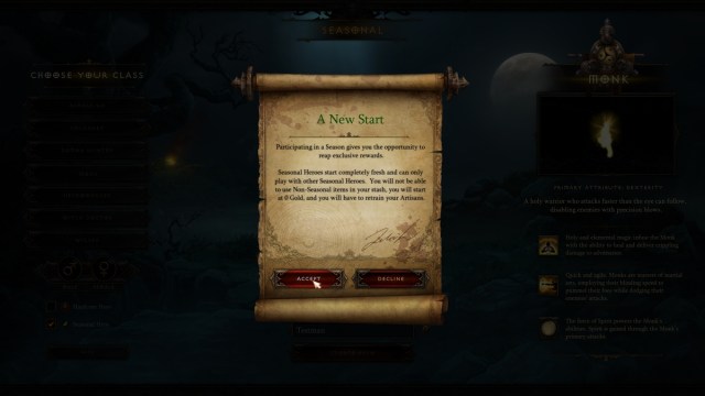 To participate in a new Season, you must create a Seasonal Hero. Firstly, create one by opening the ‘create Hero’ interface and checking the ‘Seasonal Hero’ checkbox on the bottom left. It’s right under the checkbox for a Hardcore hero. Make sure Season Hero is checked and create your hero. Keep in mind: Seasonal Heroes start entirely fresh. Their stash is empty, and their artisans are level 1.