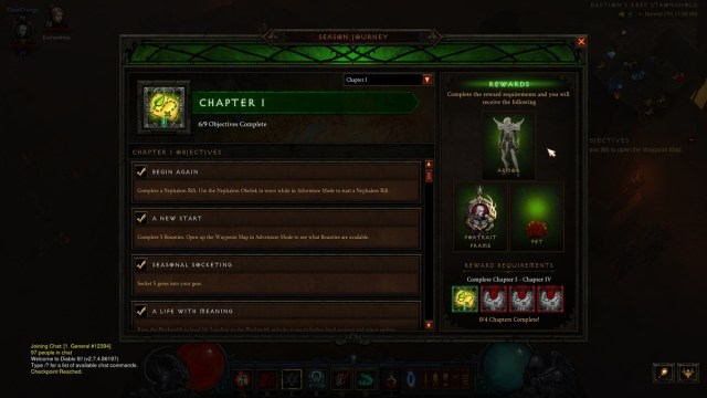 Of course, the largest part of any Diablo III Season is the Season Journey. The Season Journey is a set of achievements that grant several rewards, and is a huge part of how seasons work in Diablo III. Some rewards are cosmetic, such as pets and portrait frames, while others provide powerful gear for your character.