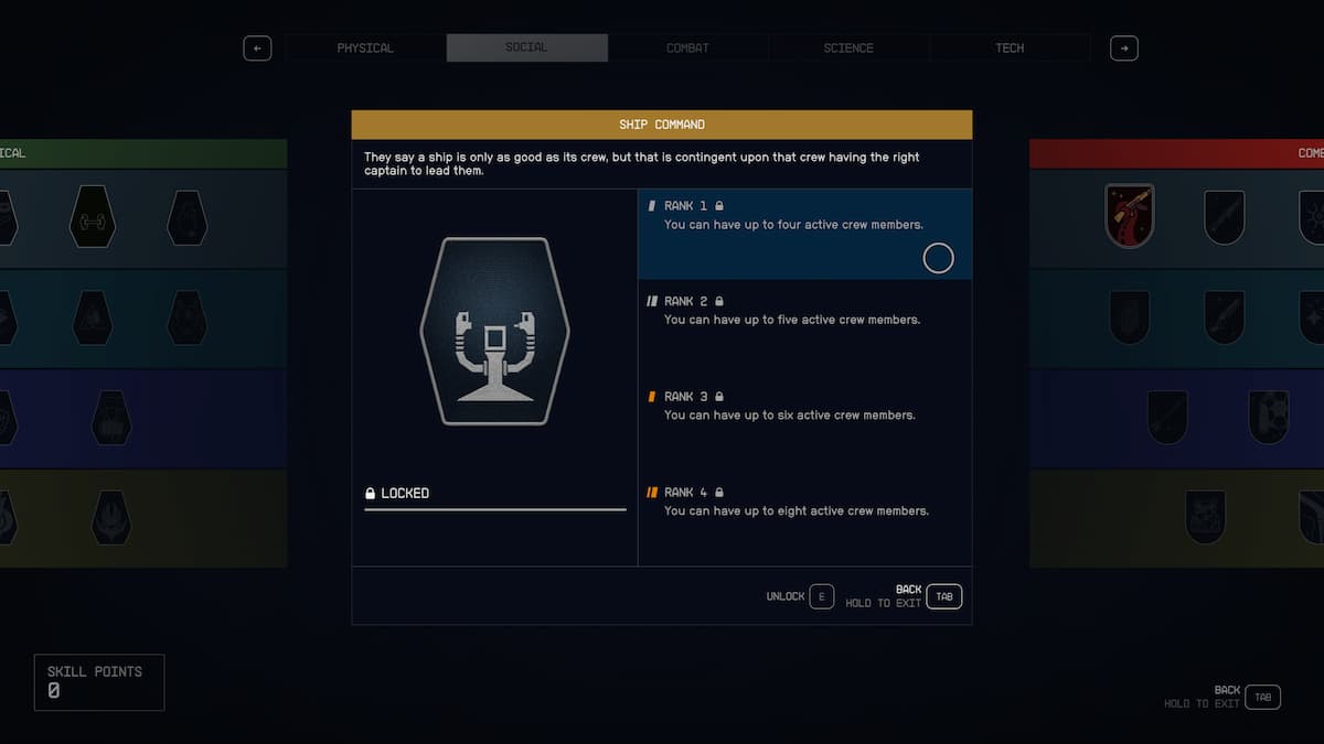 The easiest way to increase your crew member capacity is to acquire and level up the Ship Command skill in Starfield. It belongs to the Social skill tree, but it is a tier 4 or master skill. This means that you will have to spend 12 skill points in the Social skill tree to be able to purchase this skill’s rank 1. It is worth it, though, since it will increase your active crew member capacity, becoming one of the best skills in the game. Not only that, but you will unlock its ranks by destroying or boarding enemy ships, which arguably is one of the funniest aspects of Starfield.