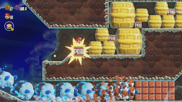 Keep going and catch a ride on the stampede as it launches into the air after that platform. This is the most dangerous part of the stage. As the stampede touches ground, jump onto the ledge to the right and break the nearest POW block. The explosion clears the passage so you can keep running. Do this quickly, or you’ll get stuck and the liquid will end your run.