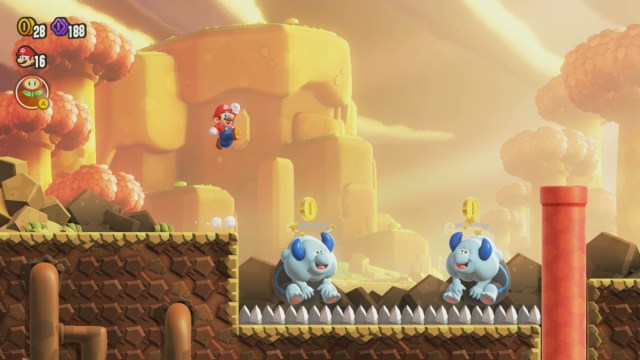 Continue to the right. Not that you have any real choice. On the next bit of land, you can jump between enemies to grab a Flower Coin, if you’re feeling brave. The stampede soon reaches a ledge that ascends sharply toward the right.