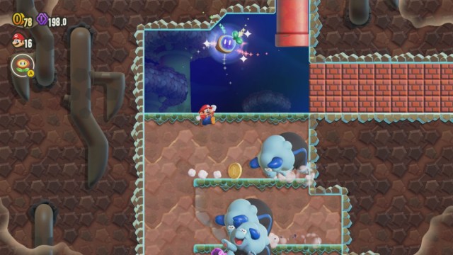 A second P-Switch hangs from the ceiling. Bop it if you wish. You can also ride the stampede as it arcs downward toward the purple soup, then jump to a ledge and rush along it to grab another Flower Coin, if you like taking risks. I don’t like taking such risks if I’m just trying to complete the stage for the first time.