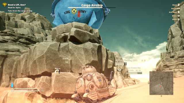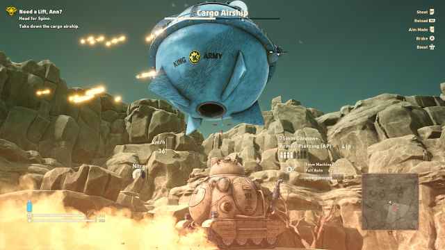What the game intends you to do when climbing that patch of sand is to be able to aim your tank shots directly at the Cargo Airship. However, as soon as you do so, then the Airship will come and try to shoot you to oblivion. The trick will be hiding behind rock formations in the area, making the ship come down to find you. I don’t know about you guys, but it’s nice to see that not only random video game goons lack any type of situational awareness, but also entire Airships.