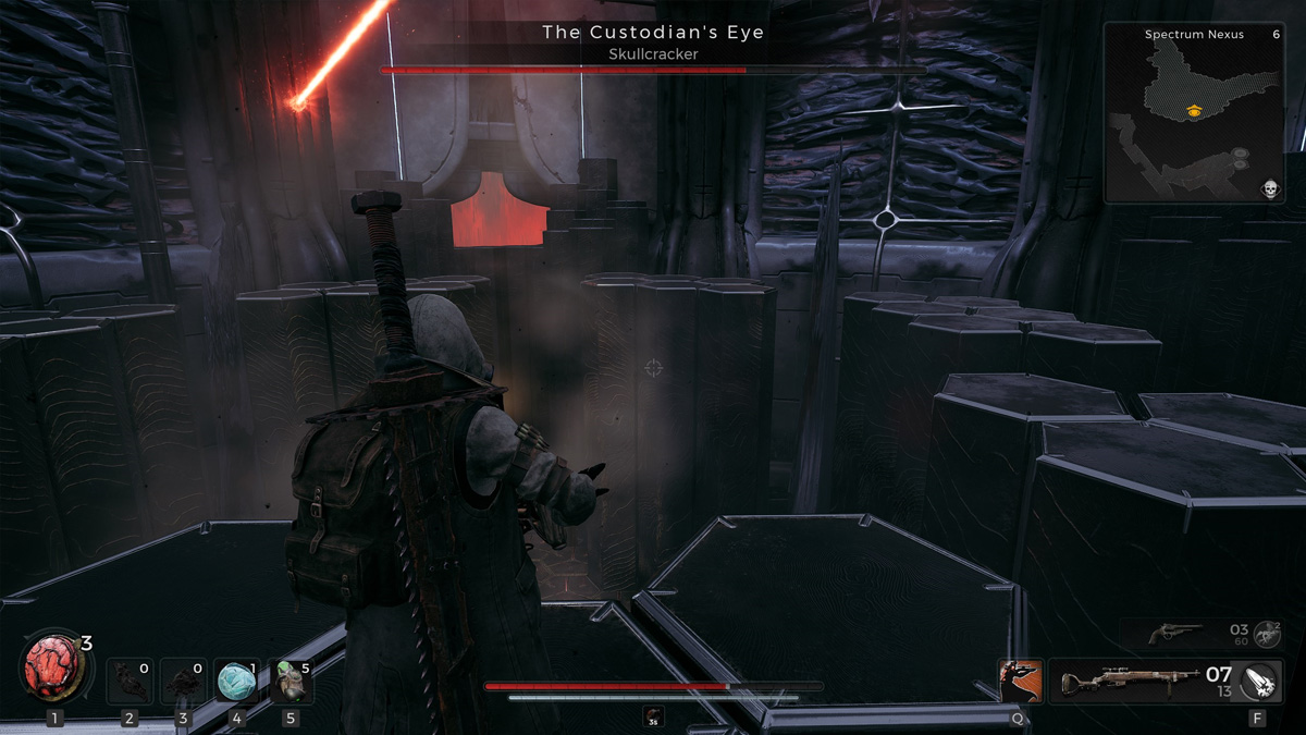That’s about all you need to know for the Custodian’s Eye. If you got a friend, playing this fight in co-op becomes much easier. The purple laser beam attack only targets one player at a time, so the other can focus on damage. And two or three players can make short work of the tiny robots that appear. So, if you can pair up with someone, be sure to do that.