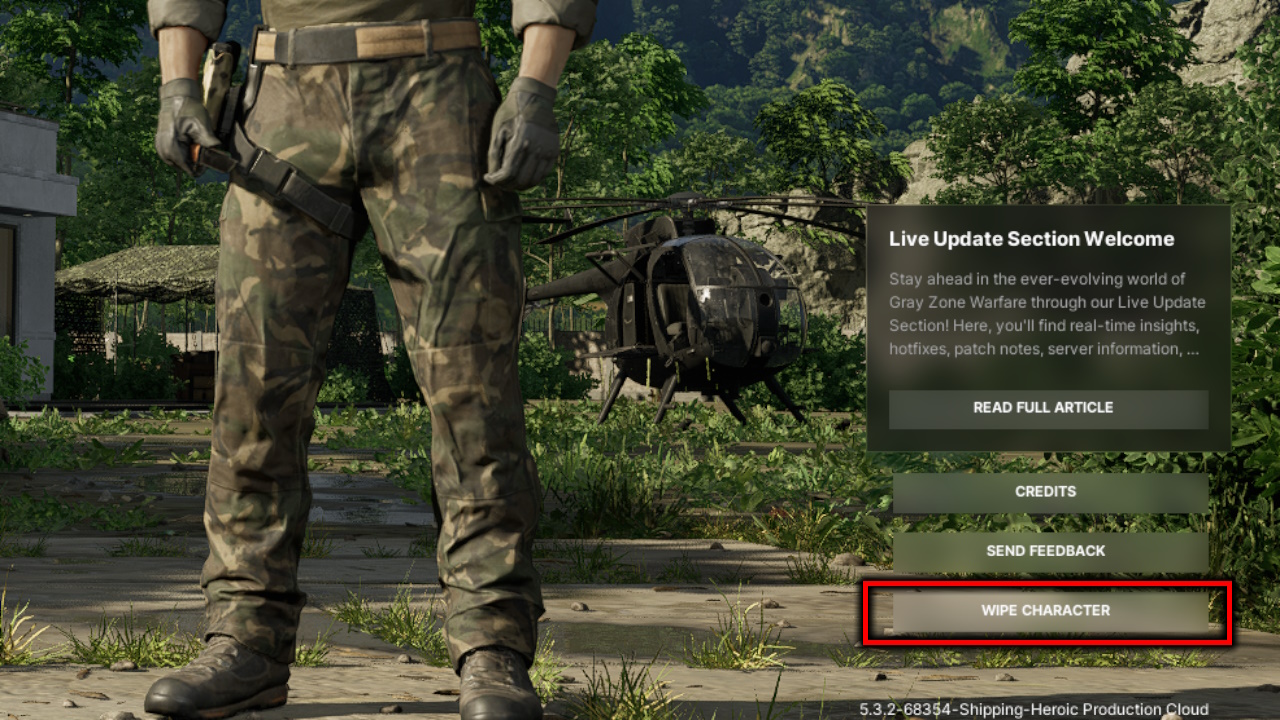 Open Gray Zone Warfare and press the Wipe Character button (pictured above) in the bottom corner of the screen. You can only have one character at a time, and the system does have a couple of limitations: