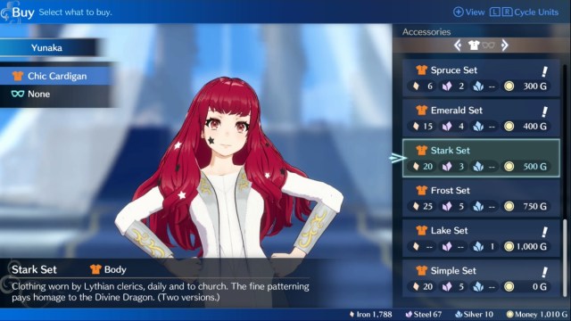 Available costumes come with an associated cost in materials and typically (though not always) require you to invest some of your hard-earned gold. For instance, the Stark Set for Yunaka (pictured above) requires 20 iron, 3 steel, and 500 G to purchase. Some options require more precious material.