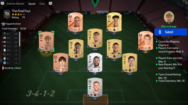 The first entry into the Hybrid Nations SBC in EA Sports FC 24 asks you for four different nations across the squad, with a maximum of four from one nation being able to be selected. You also need four rare players, and an overall team rating of 70. I decided to use the Premier League and a few extra leagues like the Eredivisie and Championship, because that’s what I had in my club. Most of this SBC group was done with only the players available in my club, so make sure you’re not spending too much money on players for this.