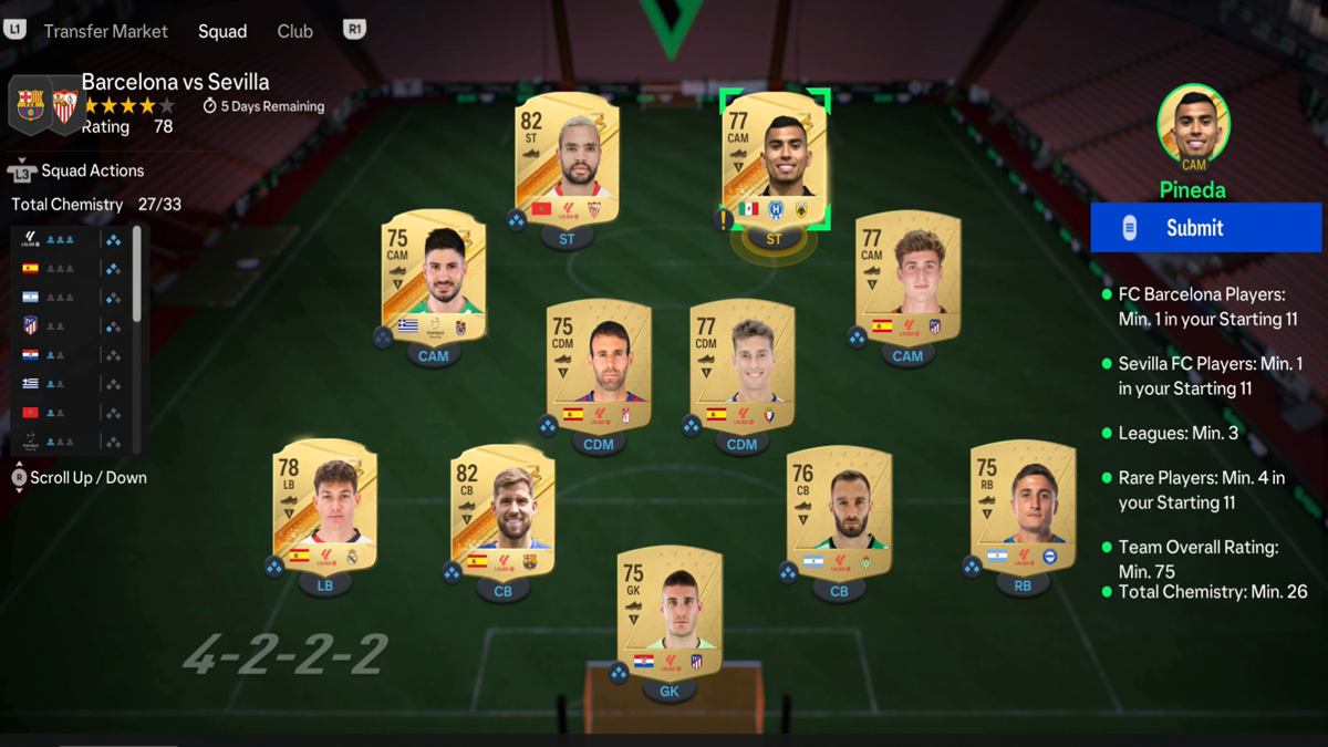 For this SBC you need at least one FC Barcelona and Sevilla player, a minimum of three leagues, and at least four different rare players. Once again here I just used La Liga to get the chemistry and then put two players from different leagues in to fill the requirements and complete Marquee Matchups for the week of 28/09/23.