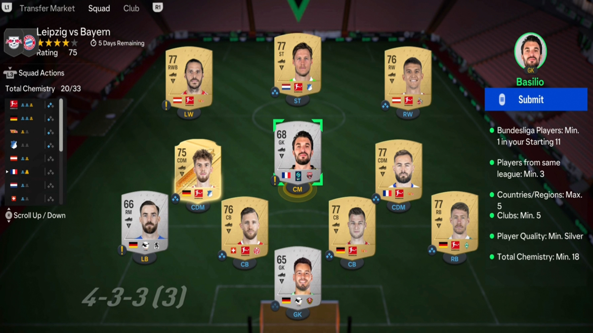 This Marquee Matchups SBC in EA Sports FC 24 requires you to have one Bundesliga player, and a minimum of three from the same league, minimum five different clubs, but a maximum of five countries or regions. I personally just stuck with using the Bundesliga for this one, as I had a lot of Bundesliga players in my club from opening the various rewards for SBCs and Objectives. Once I had the chemistry, I made sure to use silver players to bring the cost of this SBC down a bit.