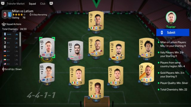 The next Marquee Matchups SBC in EA Sports FC 24 requires you to use a minimum of one Milan or Latium player, a minimum of two Italian players, and have a minimum of four players from the same country or region. For this, once again I stuck with the league that the main two clubs are from, this time being the Serie A, and decided to make my four players from the same country or region Italian, as I was putting two in either way.