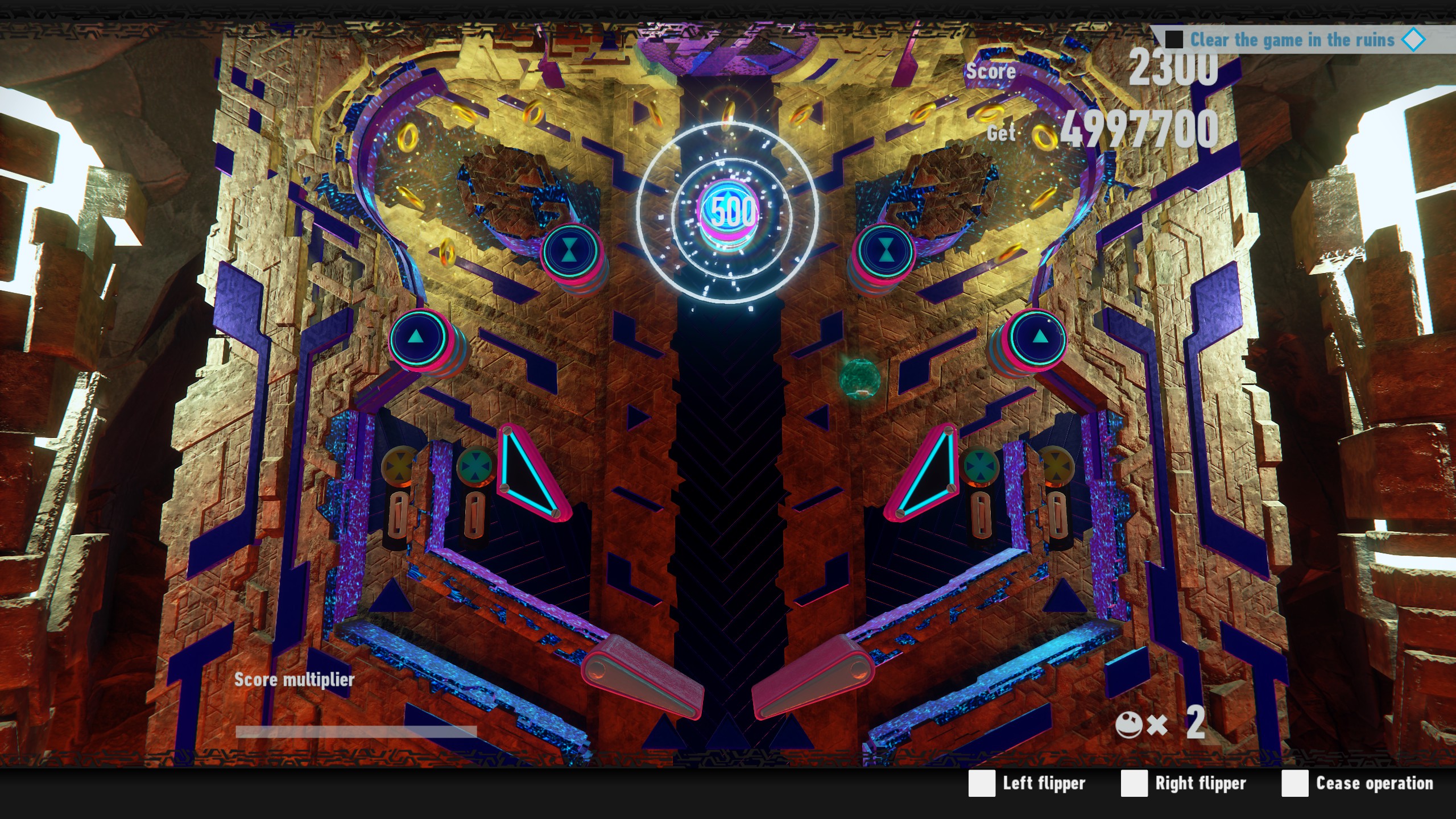 If getting five million points sounds like a tall order, that’s because it is. You’ll no doubt immediately notice that getting points for hitting bumpers and grabbing rings is just a tiny drop in the bucket. The key here is to get score multipliers. Do your best to keep the ball from falling. Hitting both flippers at once is a good way to keep it from falling into the middle if you’re not sure where it’ll be going. The main thing to keep an eye out for are red rings, as grabbing one will double your multiplier.