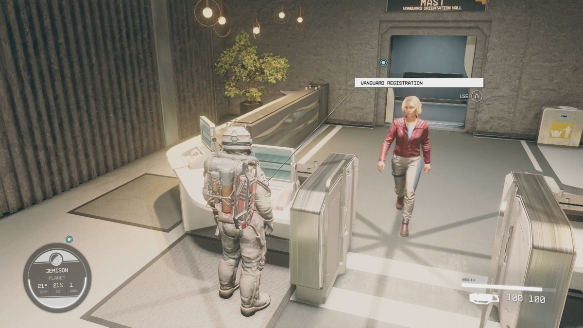 As you enter the hall, check with the Vanguard Registration terminal. You will need to accept the Enlistment Agreement. Then you should proceed through the adjoining Orientation Hall. Here, it’s possible to activate different pedestals that piece together the history of the United Colonies and early activity in space. Reading everything can take some time, but it’s quite informative.