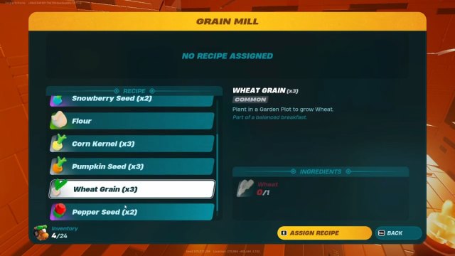 After you have collected all the necessary materials, come to your base and open your recipe book to craft a Grain Mill from it.