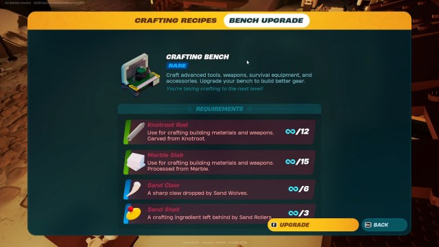 - Rare Crafting Bench: x12 Knotroot Rod, x15 Marble Slab, x6 Sand Claw, and x3 Sand Shell.