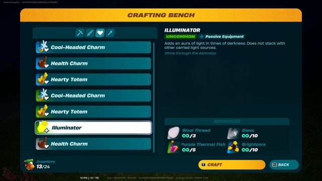 To craft an Illuminator in LEGO Fortnite, you need to go to the Charm section in your Crafting Bench. The crafting requirements for an Illuminator are high, but thankfully, you only need to craft it once. From there, you need the following items: