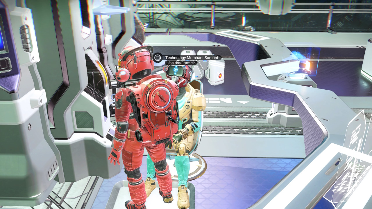 Every new starship needs a Reactor Core. Fortunately, they are easy to obtain. Head upstairs and talk to the Starship Research Technology Merchant. This Vendor won’t speak to me unless I jump over the counter, so you may need to do that to interact with them.