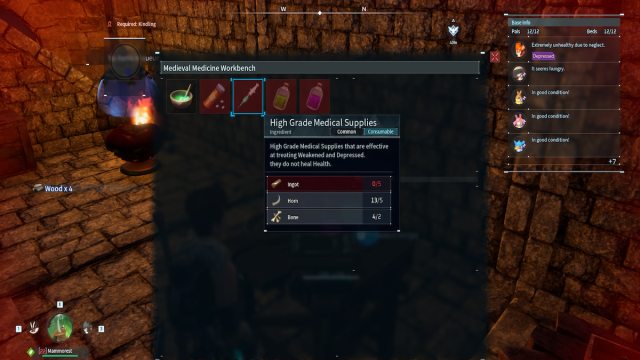 Using the Medieval Medicine Work Bench, you can produce different medicines to treat the different status effects of your Pals. However, to treat the Depressed status, you will specifically need High Grade Medical Supplies. High Grade Medical Supplies need the following items to be made.