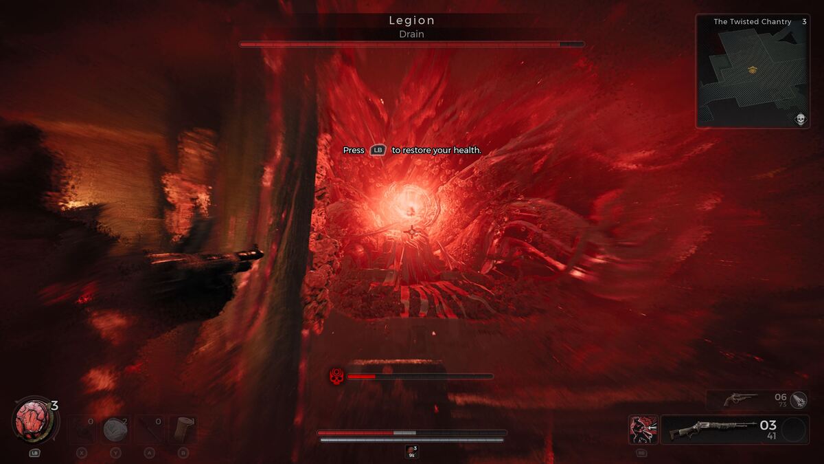 After shooting Legion Drain a few times, you need to stay on the lookout for its attacks and the adds nearby. The body at the front of the room will send out a red shock wave that deals serious damage to you. To dodge it, you need to execute a perfectly timed roll. You also need to look out for when Legion Drain turns red and shoots red Rot orbs at you. Then, be on guard for exploding enemies and other monsters that will charge you.