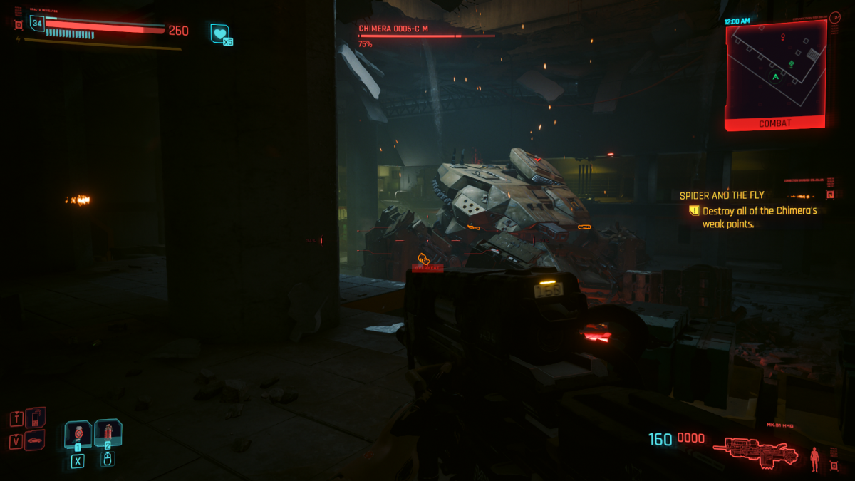 In short bursts and using the highest damage weapon you have, pick away at the various weak points on the Chimera in Cyberpunk 2077: Phantom Liberty. I would recommend going to the joints on the legs first and using something like an explosive sniper rifle or precision rifle. You will only get short moments to pop out of cover and fire.