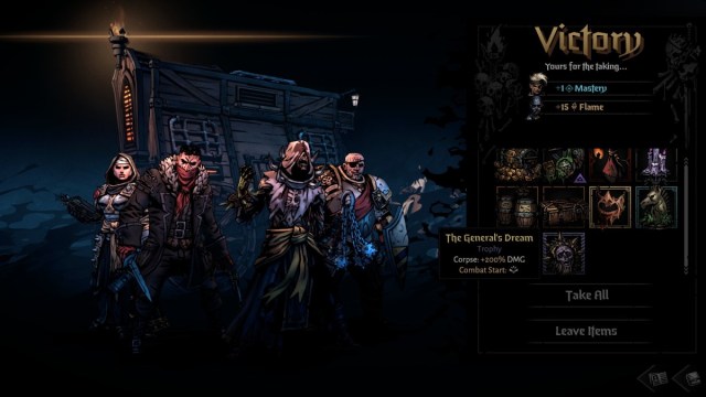 If you can keep your head above water throughout the fight, then you will eventually be able to finish the Dreaming General off. For doing so, you’ll receive a veritable cornucopia of goodies, including Mastery Points, Relics, Baubles, Combat Items, Stagecoach Items, and a Trinket. You’ll also receive the General’s Dream Trophy, which you can equip to your Stagecoach to root your party in place, and grant them +200% damage against enemy corpses. As with all Trophies in the game, it will also allow you to enter the Mountain on Confessions beyond the first.