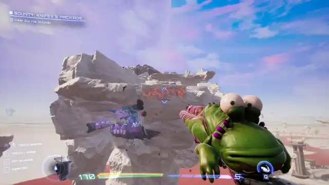 Jetpack over and use Knifey’s grapple to grab onto the wall, where you can start climbing across the wall. You’ll need to jump over to the other wall once you’ve got far enough. Just be careful of the wind! Do a wall jump one more time and you’ll come across a hive. Your suit will tell you to launch “one of Creature’s little kids” into the hive to push out a hook bug. Jump and jetpack over to the hook bug to be slung toward the giant spire. You’ll need to use Knifey again to climb up the ledge if your fuel runs short before the ledge.