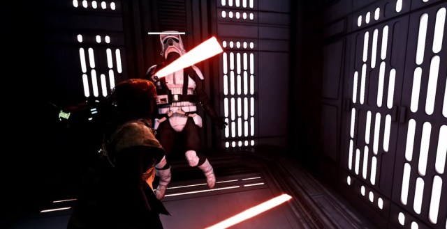 When you reach him on the Imperial Base, Nova Garon, he’ll be at the end of a long corridor. Normally, this is where you’d fight him, but in this case, run up to him but don’t attack him. He will start to attack you the closer you get, so when that happens Force Dash if you have it, or jump away from him.