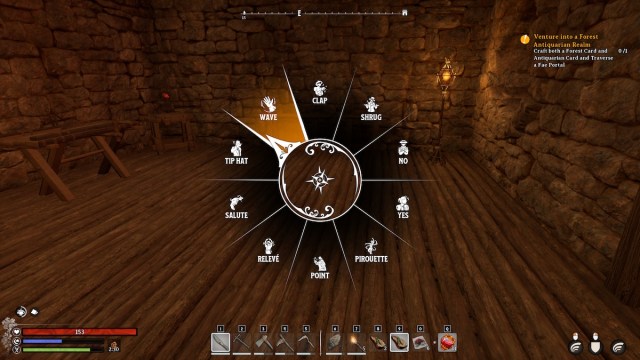 Holding the Z key will show you a total of 10 diverse emotes you can perform, and if you’re in first-person, it’ll instantly switch to third-person mode to show you what you’re emoting. You can emote typical things like yes, no, and shrugging. These can be useful in circumstances where you don’t want to talk in chat but would rather emote your answer.