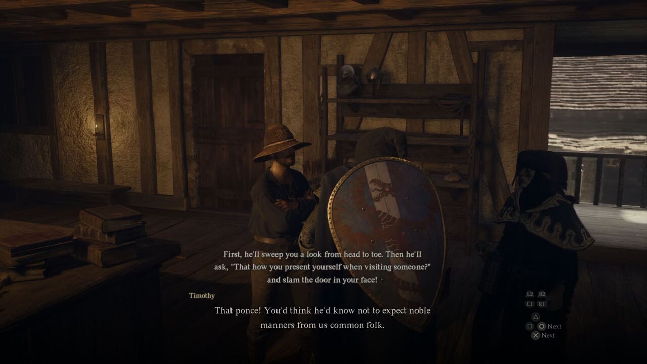 I tried changing Vocations to Sorcerer and tried multiple times, and still, Myrddin doesn’t let you in. The only way to get into Myrddin’s house and stay on his good side is to wear Courtly clothes. I learned this after leaving and returning to Checkpoint Town. An NPC named Timothy approached me and gave me an additional hint that Myrddin looks at you “from head to toe” and “expects nobility.”