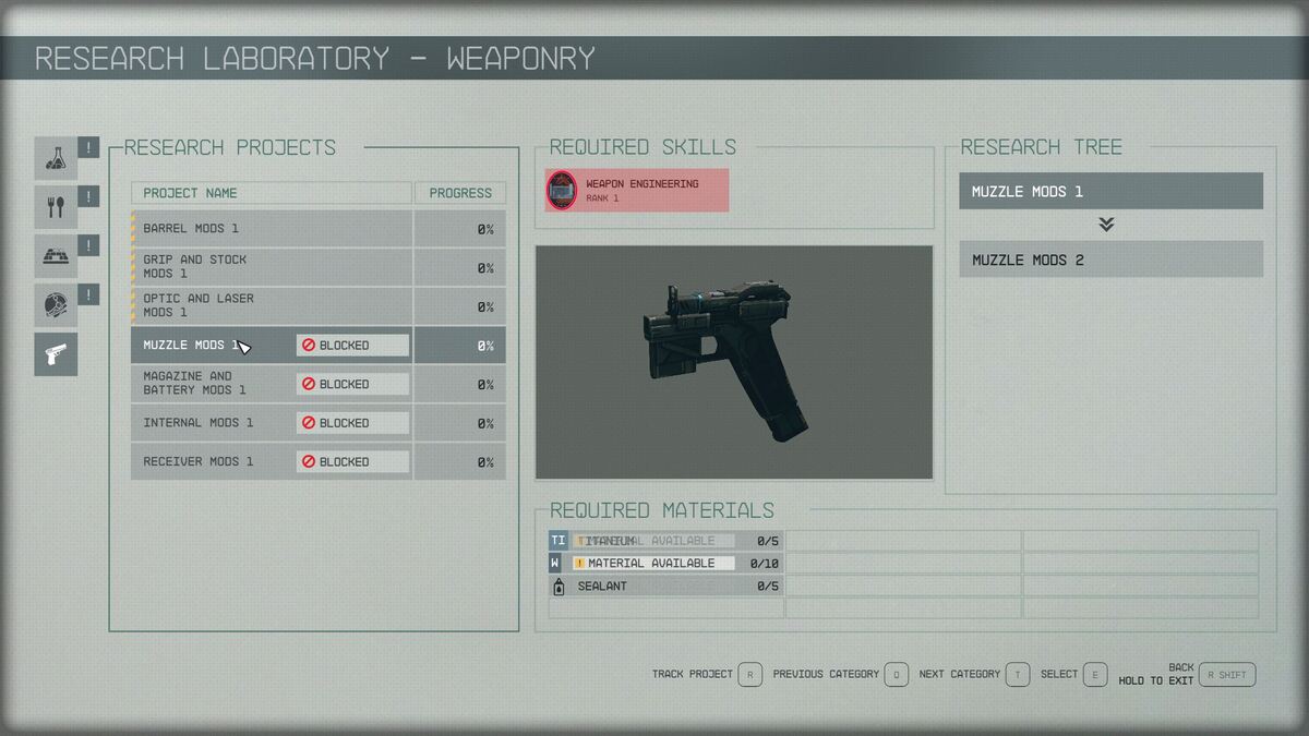 Once you’ve researched Muzzle Mods 1, you may need to rank up Weapon Engineering and you’ll likely need more of the same materials and maybe a few others too to complete the Muzzle Mods 2 research.