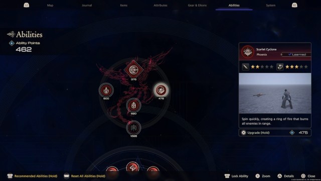 But how do you unlock new Eikon Abilities? It won’t take long before you’ve earned a few Ability Points in your Abilities skill tree. After you complete a few rounds of combat, Clive will rack up Ability Points to spend on new attacks. To the right of the Gear and Eikons screen is your Abilities screen. The main circle are the Abilities you can’t equip, and just become new skills. Above that are your Phoenix Abilities.