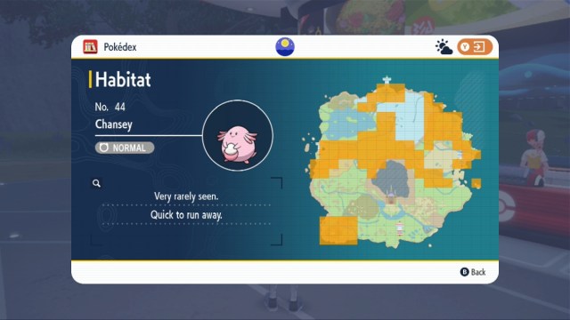 Chansey is a pretty rare Pokémon, despite appearing throughout large swaths of Paldea (see the screenshot below for a map of its habitats). If it spots you, it will likely run away rather than engage you in combat. Even when you engage, you may have to go through a few of your more costly Pokeballs to catch one. The process works like so: