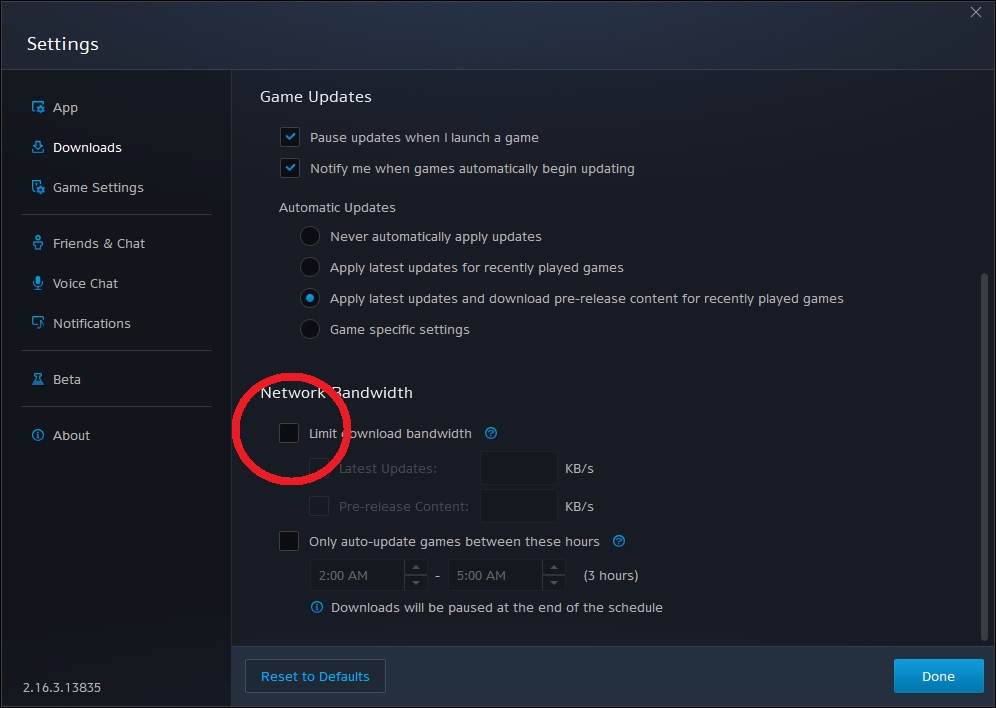 - Scroll down to the “Network Bandwidth” section and uncheck “limit download bandwidth.”